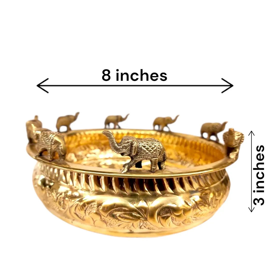 Handcrafted brass urli bowl with detailed elephant designs on the circumference
