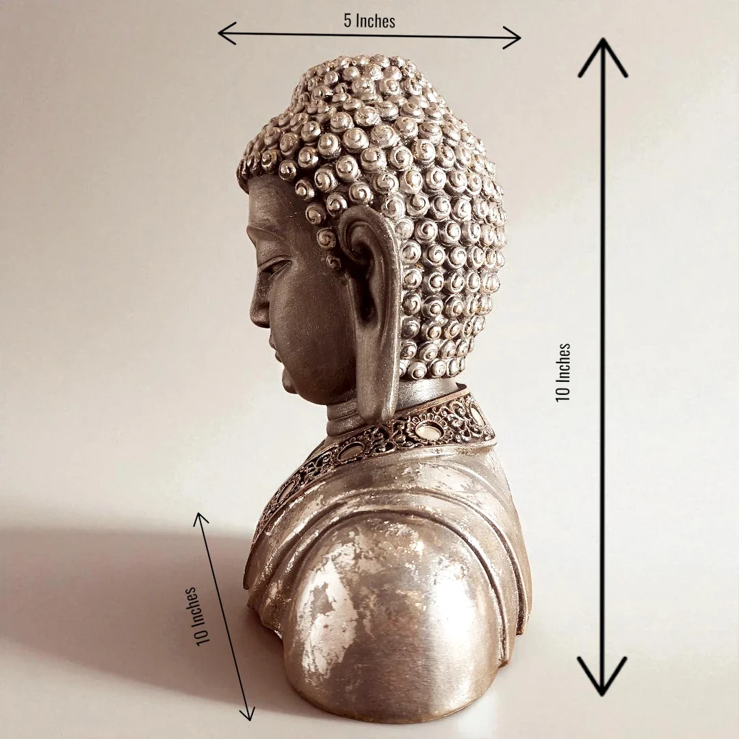 Add an aura of peace and style to your space with this elegant Buddha bust idol. Crafted from premium polyresin, this 10-inch figurine features a serene grey finish accented by stunning silver highlights and deep, lifelike detailing. Its compact 10 x 10 x 5 inch size makes it an ideal décor piece for homes, offices, meditation corners, or as a thoughtful gift.