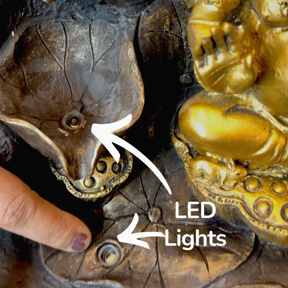 - Dual LED Ambient Lights: Two warm LEDs illuminate the idol and water flow, thereby creating a peaceful golden glow day and night.